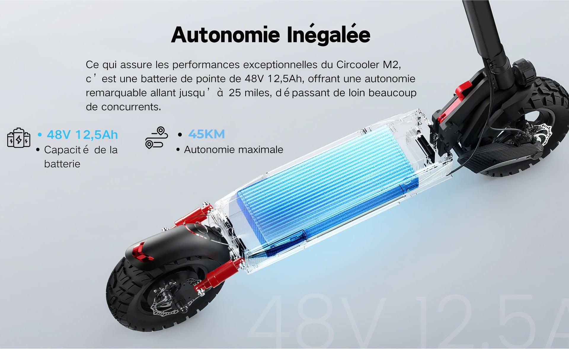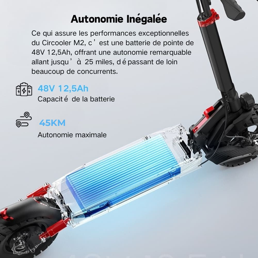 Le M2 est équipé d'une batterie lithium 48 V 12,5 Ah,batterie certifiée CE, conforme aux normes européennes.Offrant une autonomie maximale de 50 km. Le BMS surveille en permanence les performances de la batterie pour la protéger contre les surcharges et les décharges.