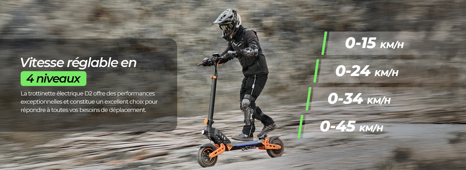 Le modèle S10MAX dispose de quatre modes de vitesse : 6/10/15/25 km/h. Appuyez deux fois sur le bouton d'alimentation pour changer le mode de conduite. Après avoir allumé le scooter, tenez le levier de frein avec votre main gauche et appuyez 5 fois sur le bouton d'alimentation avec votre main droite pour passer au mode de vitesse 15/25/35/45 km/h.