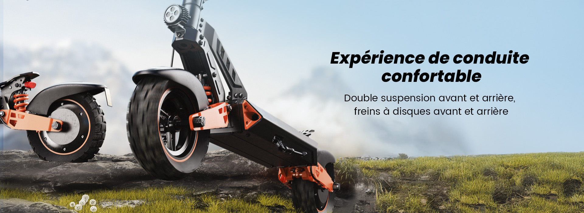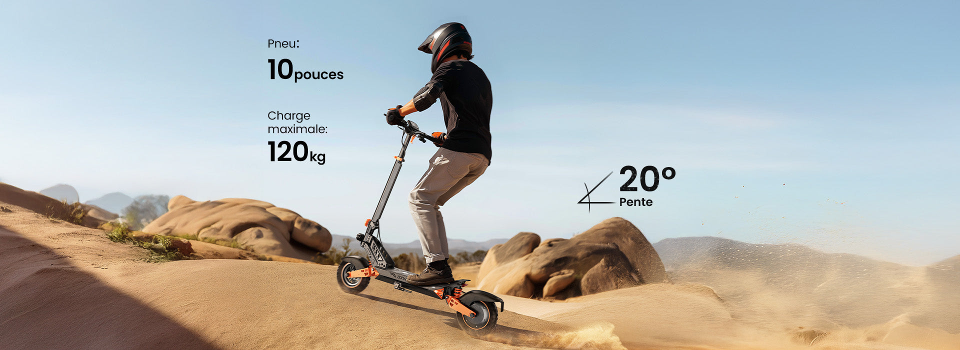 Le S10MAX est un modèle hybride, conçu aussi bien pour le tout-terrain que pour les trajets urbains. Son autonomie est même prolongée en mode urbain. Équipé de pneus increvables de 10 pouces et d'un système de double amortissement hydraulique (avant et arrière), il absorbe efficacement les chocs. Son moteur puissant de 1000W en puissance de crête lui offre une ascension et une capacité suffisante pour franchir herbe, chemins de terre, graviers et autres surfaces irrégulières.