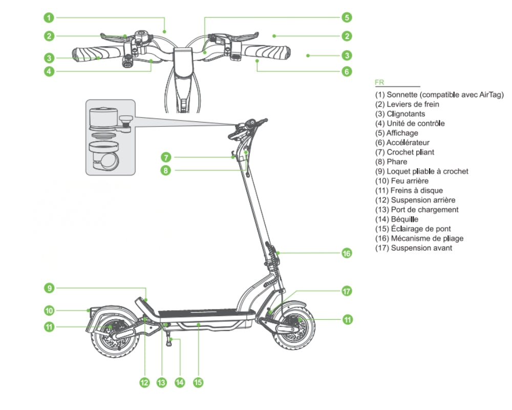 La trottinette est équipée d'un double système de freinage combinant freins à disque et freins électriques :