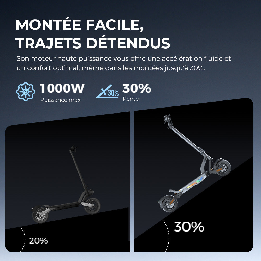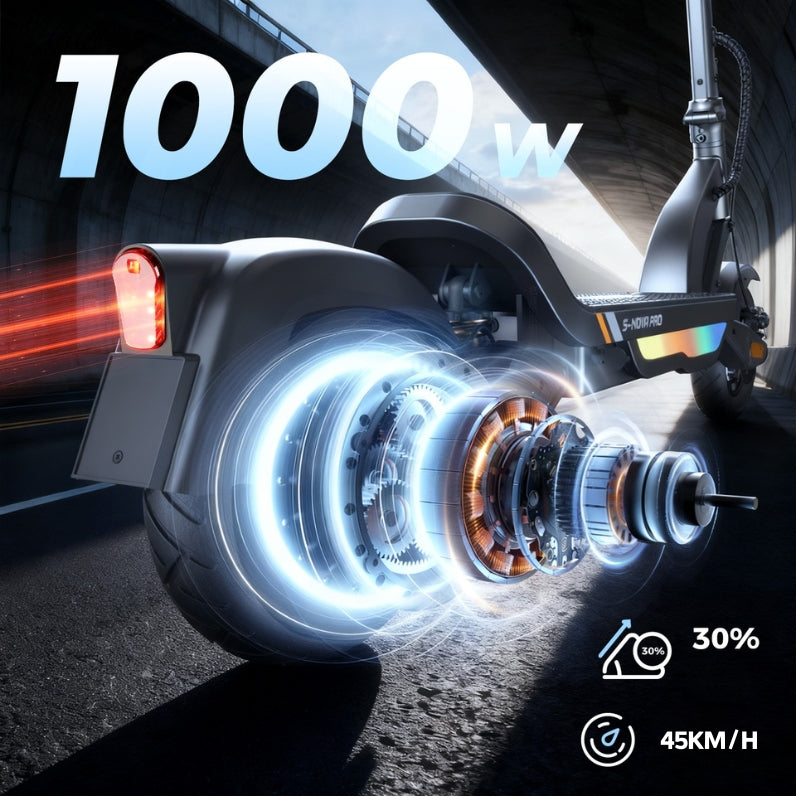 Le S-Nova Pro est équipé d'un moteur sans balais haute performance d'une puissance de pointe de 1000W. Non seulement il offre un démarrage rapide et une accélération fluide, mais il peut aussi facilement gérer des pentes jusqu'à 30° en milieu urbain. Que ce soit à la sortie d'un parking souterrain ou sur une rampe d'échangeur, elle vous offre une puissance suffisante pour circuler sans entrave.
