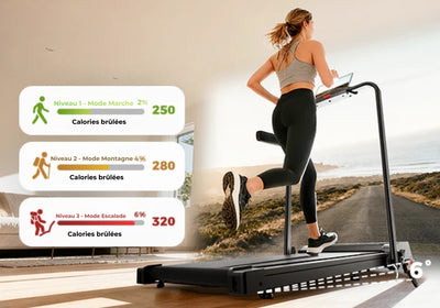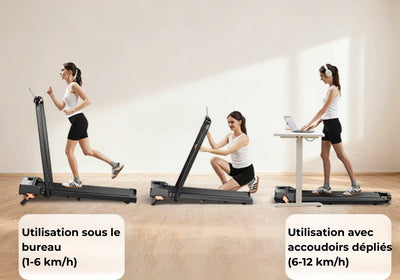 Mode Marche (6 km/h) et Mode Course (12 km/h) Gain de place idéal pour la maison ou le bureau – Alternez entre marche et course d'un simple clic.