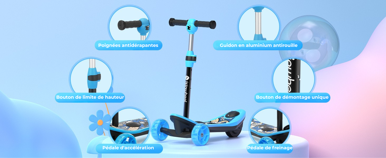 Appuyez sur le bouton d'alimentation pendant 1 seconde pour allumer et éteindre la trottinette. La lumière d'ambiance s'allumera lorsque la trottinette est allumée et s'éteindra lorsqu'elle est éteinte.
