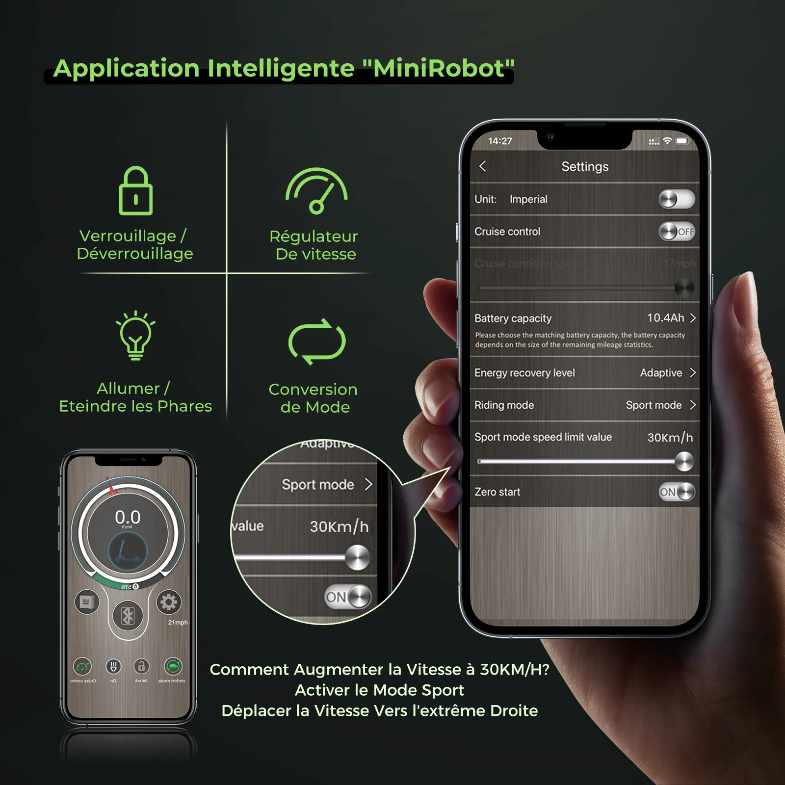 - Vous pouvez contrôler via MiniRobot/isinwheel app(Différents lots utiliseront différentes applications.) : Verrouiller/déverrouiller, allumer/éteindre la lumière, les vitesses, le mode de démarrage (démarrage zéro ou démarrage non zéro), régler la vitesse maximale, le régulateur de vitesse.