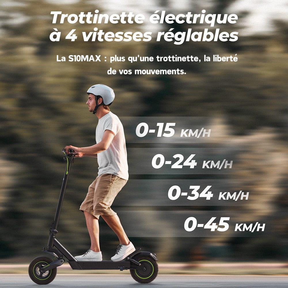 La vitesse maximale du S10MAX est de 25 km/h. Cette conception respecte la réglementation en vigueur dans la plupart des villes européennes pour les engins de déplacement personnel. Pour une utilisation tout-terrain, il est possible de déverrouiller le limiteur de vitesse, permettant d'atteindre une vitesse maximale de 45 km/h en mode hors route.